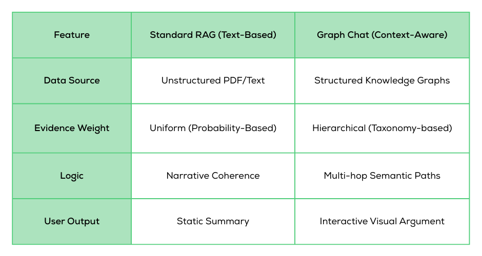 We believe the path forward isn't "bigger models," but better context. Graph Chat replaces the flat text-chunking approach with precise context engineering.